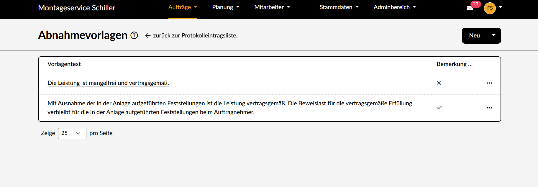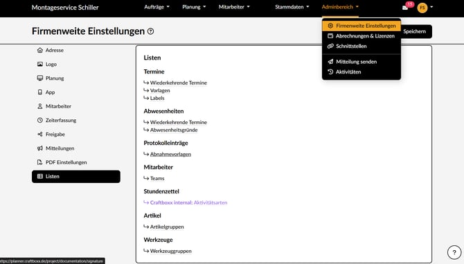 - Öffne im Planer unter "Adminbereich" -> "Firmenweite Einstellungen" -> "Listen" die Übersicht deiner Abnahmevorlagen.