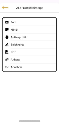 - Scrolle zum Bereich "Protokolleintrag". Du kannst über den Schnellzugriff Fotos, Material, Notizen und deine Auftragszeit hinzufügen. Für alle weiteren Einträge klicke auf "Alle Optionen".