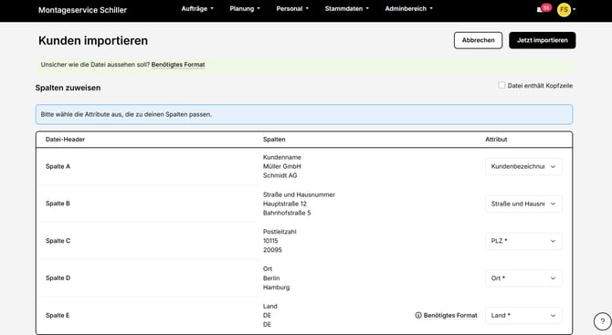 - Wähle nach dem Hochladen deiner Datei unter "Attribut" alle mit Stern markierten Pflichtangaben für die passenden Spalten aus. Dies ist notwendig für eine reibungslose Übernahme der Kundendaten in die Craftboxx.