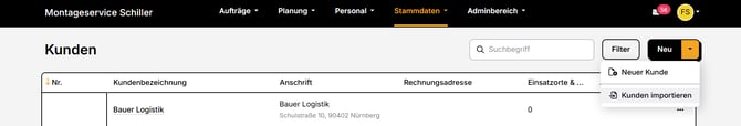 - Gehe unter "Stammdaten" -> "Kunden" auf den Pfeil rechts neben "Neu" und anschließend auf "Kunden importieren".