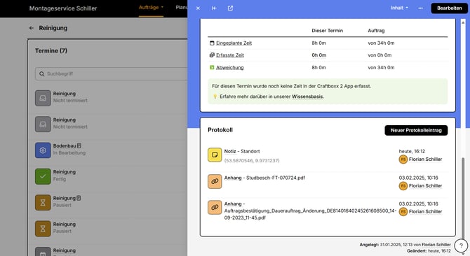 Mithilfe der Craftboxx-App und Google Maps kannst du deinen aktuellen Standort bei spontanen Änderungen als Notiz festhalten und in Echtzeit an den Planer übermitteln, wo die Koordinaten nachträglich im Termin ergänzt werden. So bleiben deine Einsatzortdaten stets aktuell.