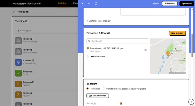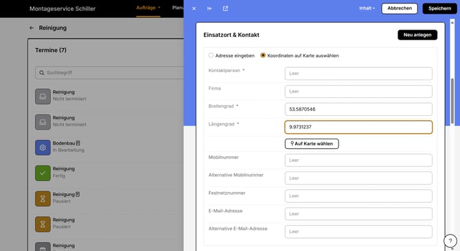 - Klicke auf "Bearbeiten", scrolle zu "Einsatzort & Kontakt" und wähle "Neu anlegen".