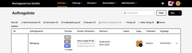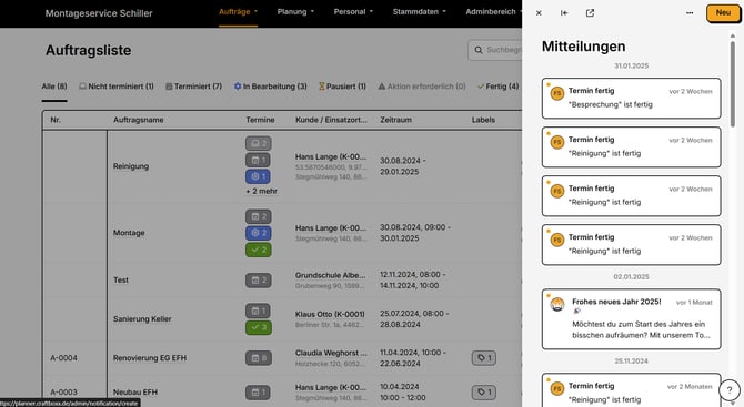 - Dort siehst du alle Mitteilungen. Über die Funktion "Neu" sendest du eigene Mitteilungen an Planer-Personal und App-Personal.