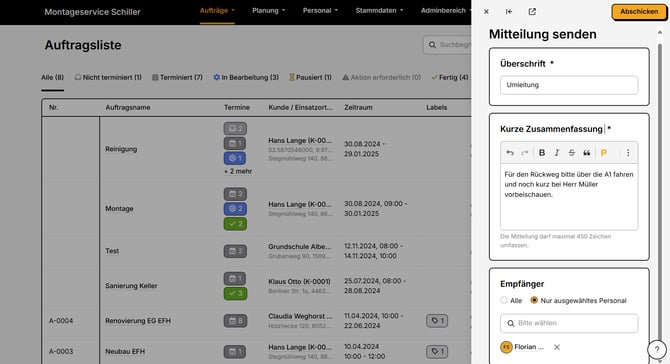 Du hast die Möglichkeit über den Planer an das Planer-Personal, als auch das App-Personal Mitteilungen zu schicken.
